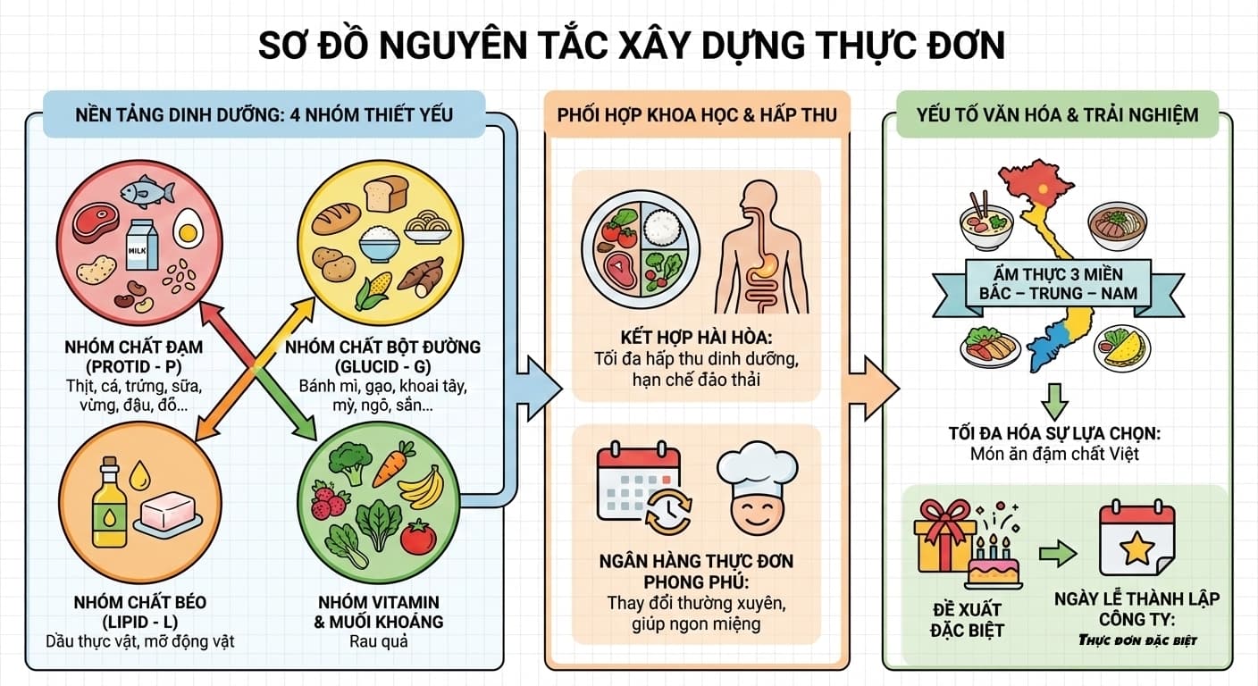 Thực đơn cần bảo đảm các chất dinh dưỡng: đủ 4 nhóm thực phẩm Protid, Lipid, Glucid, Vitamin và muối khoáng.